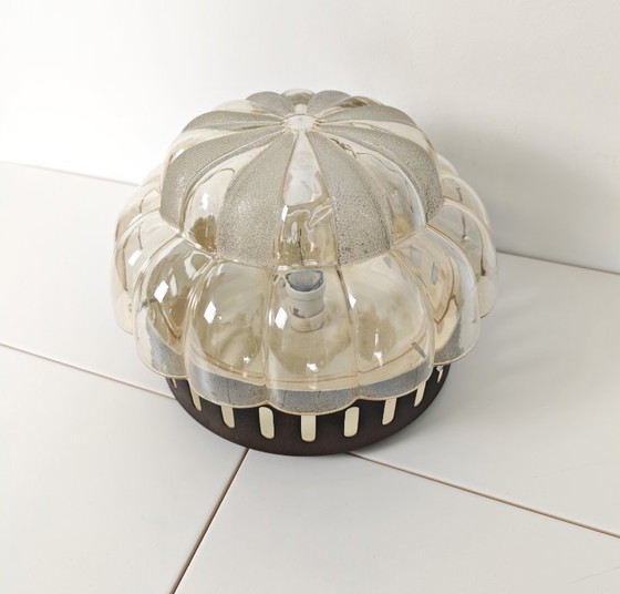 This impressive XXL hand-blown amber glass lamp adds a touch of mid-century modern style to any space. Whether you install it as a wall or ceiling lamp, its built-in design ensures a seamless blend of style and functionality. Light up your home with this attractive piece that showcases the timeless craftsmanship of a bygone era.