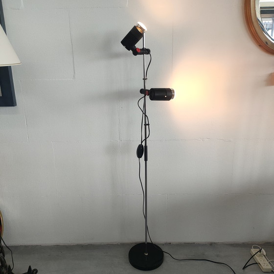 Extraordinary floor lamp with 2 spots from the 60-70s. Attributed to design by Roger Tallon (French designer) for Erco (manufacturer). Adjustable spots in height & width. This designer lamp is designed this way, there are no caps in front of the lamps. The spotlights can be turned on and off independently via a switch. Additional info on dimensions: Base diameter is 24 cm, spotlights diameter is 6.5 cm.