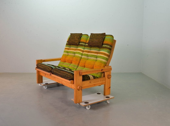 Mid-Century Scandinavian cheerful 2-seat sofa, model Dymling designed by Yngve Ekstrom in the 1970s by Swedese. The colorful quality fabric of all cushions is in a very well preserved condition and each cushion has a removable head cushion. The frame of the sofa is made of solid pinewood. The proof of authenticity is branded on the wooden frame. This original Swedish sofa is overall in a well preserved vintage condition, with some light wear on the frame according its age and use. The seating comfort is great and the fresh color combination of the fabric gives this sofa a radiant look. Dimensions: Height: 100 cm, Width: 140 cm, Depth: 90 cm, Seat height: 42 cm, Armrest height: 45 cm