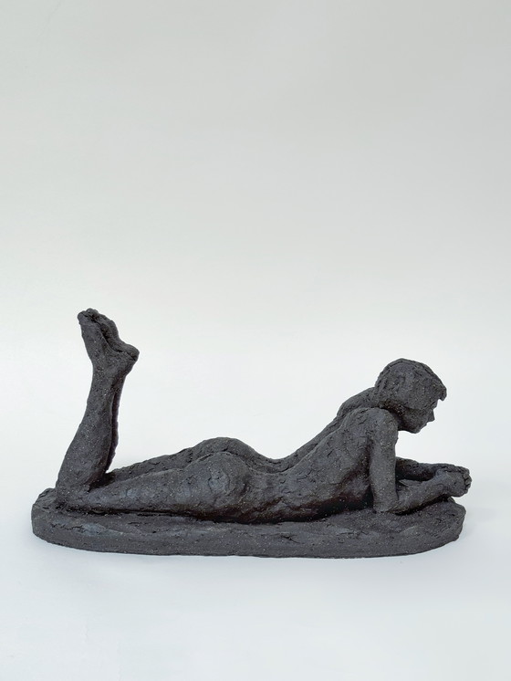 This terracotta sculpture by Yolande Ide, created in the 1960s, beautifully embodies the raw and unfiltered essence of Art Brut. Sculpted in clay with chamotte (small fired clay granules), the material gives the piece a tactile, earthy texture that enhances its expressive authenticity. The figure is captured lying on her stomach, her hands delicately clasped, exuding an introspective calm.