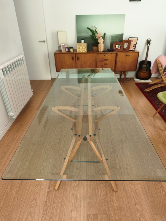 The Reale table is a contemporary rectangular dining or desk table designed by Carlo Mollino in 1946 and revived by Zanotta in the mid-1980s. It features a complex, sculptural frame made of solid oak that resembles an aircraft wing detail or a lattice structure.