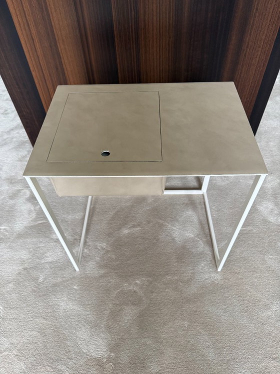 Experience the sophistication of Italian design with this beautiful bedside table by Zanotta, upholstered in white leather. This piece exudes a modern elegance that fits perfectly into any bedroom decor. The bedside table is crafted with a sleek metal frame that offers a minimalist look, while the white leather adds a touch of luxury. The clean lines and functional design make it a versatile addition to both classic and contemporary interiors. The high-quality leather and meticulous finish attest to the craftsmanship and attention to detail that are characteristic of Zanotta. Add a touch of sophistication to your bedroom with this stylish and functional bedside table. Contact us today for more information.