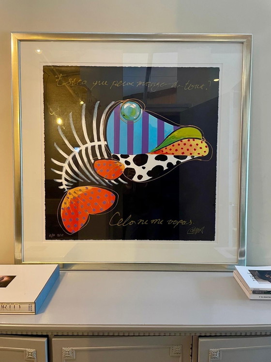 Add a splash of color and whimsy to your space with this vibrant silkscreen print by Joyce van Oorschot. Known for her playful and imaginative designs, this piece features a striking fish motif that combines bold patterns and vivid colors, making it a standout addition to any art collection.