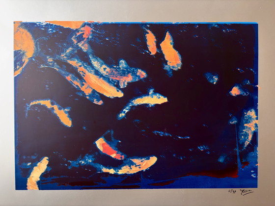 Dive into a world of vibrant colors with this stunning silkscreen print of koi carp. The deep blues and striking oranges create a mesmerizing underwater scene that will captivate any art lover. Perfect for adding a splash of color to your living room or office space.