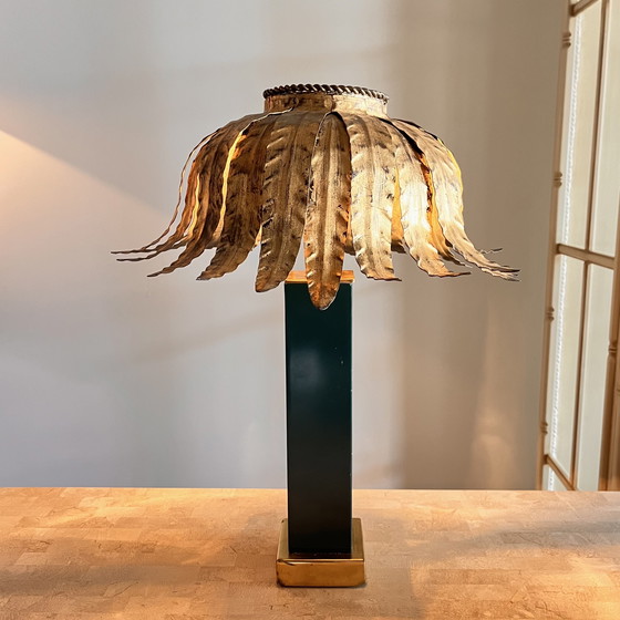 This rare and exquisite Palm table lamp with emerald green and brass base and round shaped palm leave shade, in gold finish. Attributed to Maison Jansen, a beatiful piece to add to your home