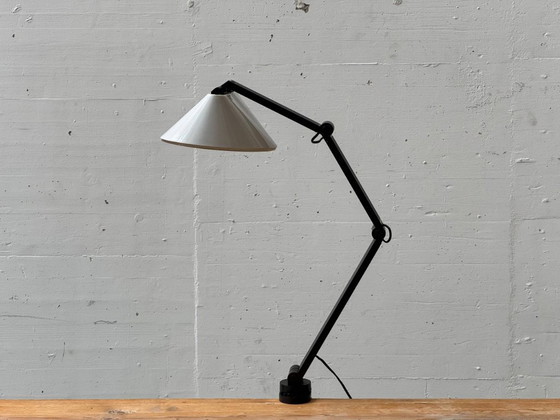 An architecturally designed clamp lamp from the 1970s, created by Franco Mirenzi and Vittorio Parigi for the Italian manufacturer Valenti Luce. The lamp impresses with its clear, functional design language and exemplifies the technically oriented design philosophy of that era. A characteristic feature is the delicate, black lacquered metal arm with multiple adjustable joints, allowing for precise light direction. The conical white shade ensures an even, warm light distribution and creates a striking contrast to the dark structure. The distinctive, ribbed joints emphasize the industrial character and are reminiscent of constructive solutions from mechanical engineering.