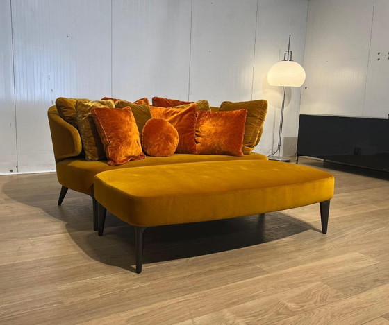 Beautiful Minotti Aston sofa with matching ottoman, upholstered in luxurious yellow velvet.
