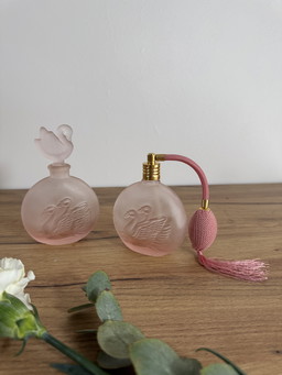 6 small pink art deco wine or water glasses with black stems, 7 cl