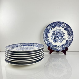 Set of 8 blue earthenware dinner plates with floral and bird decoration, early 20th centurySet of 8 blue earthenware dinner plates with floral and bird decoration, early 20th century