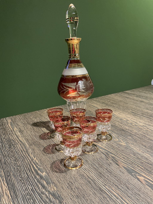 Vintage crystal decanter with crystal liqueur glasses